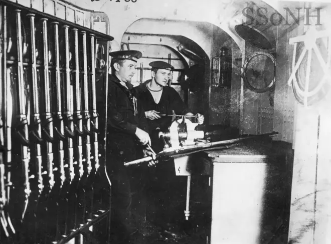 一战时期德国海军皇帝级战列舰的军械库,可见里面的M1871/84步枪。尽管这种步枪在当时已经过时了,但是由于新式的M1898步枪需要优先提供给前线部队,M1871/84步枪仍然被很多二线部队、殖民地部队和德国海军等当作标准武器使用