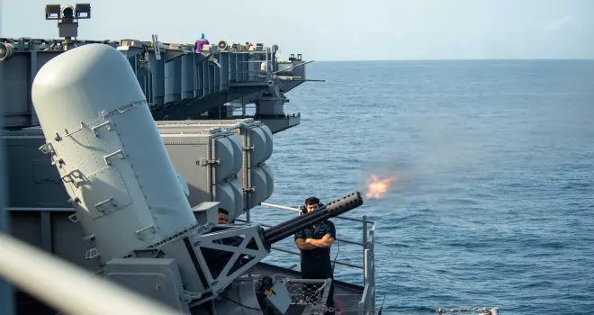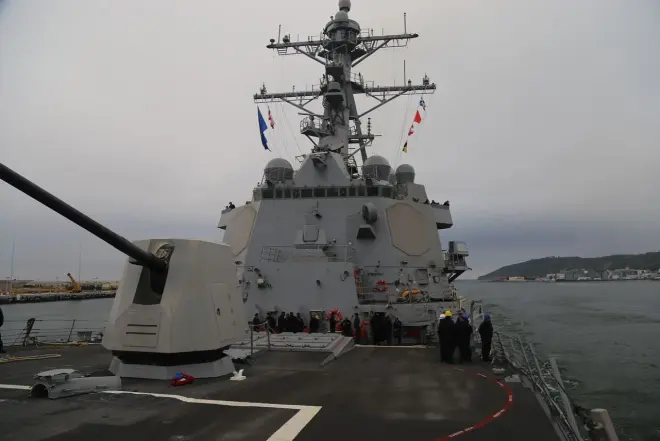 美国海军驱逐舰哈尔西号的前甲板特写,可以看到她的新ODIN激光器和SLQ-32(V)6舰载电子战套件