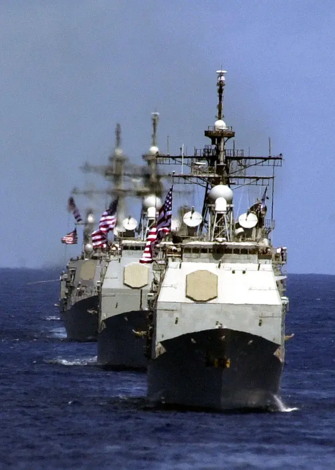邦克山号、福吉谷号导弹巡洋舰和米利尔斯号导弹驱逐舰在结束部署后准备返回本国,2003年5月