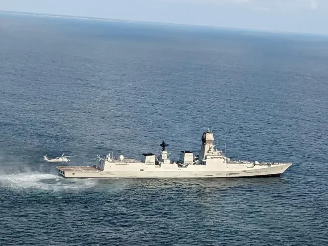 一架MH60R直升机准备在加尔各答号驱逐舰上降落