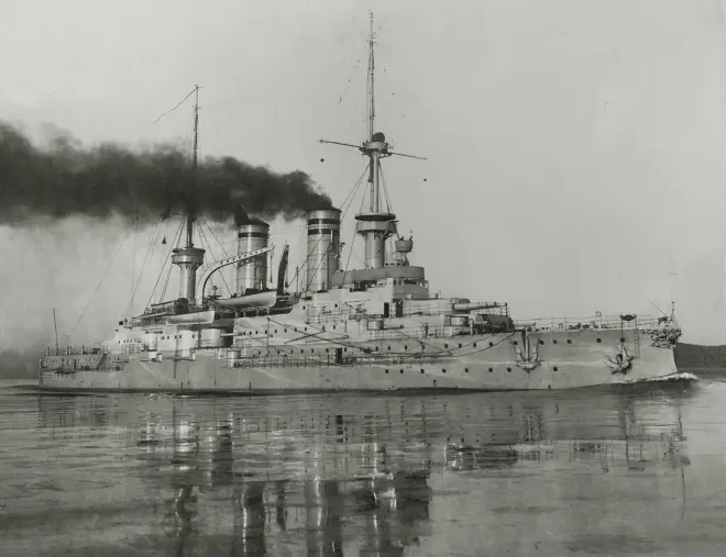 1911年夏天在比斯开湾的瑞典岸防舰奥斯卡二世号,注意舰桥上的距离刻度盘