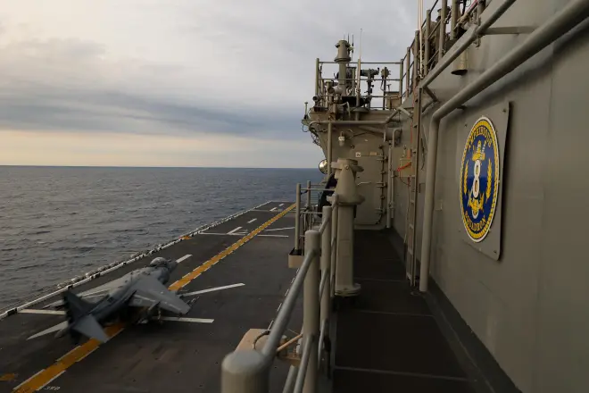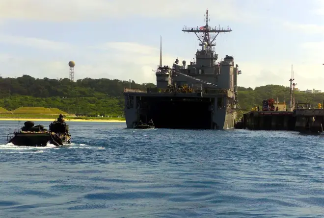 美国海军哈珀斯.费里号船坞登陆舰在演习之中,其正在准备回收两栖突击车