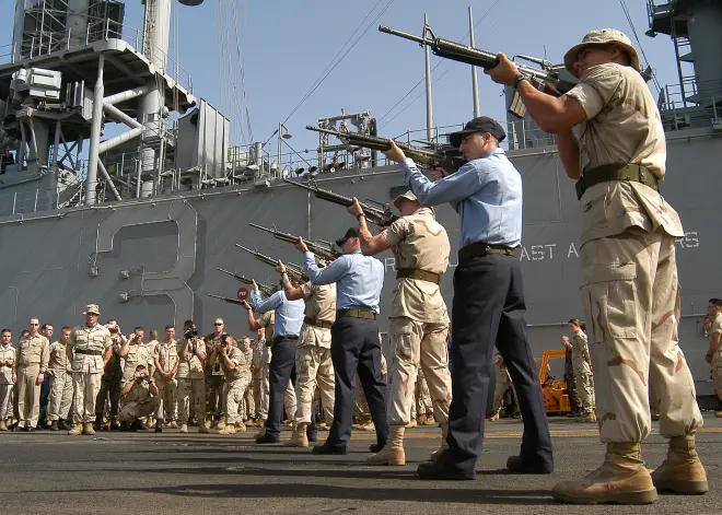 2003年5月26日,奇尔沙治号两栖攻击舰的船员在阵亡将士纪念日上鸣放21响礼炮