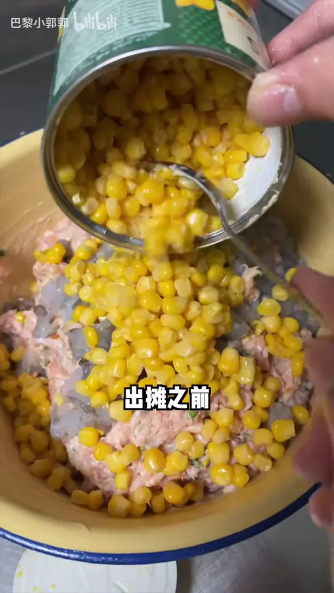 1️⃣用虾仁、玉米、猪肉制作馅料