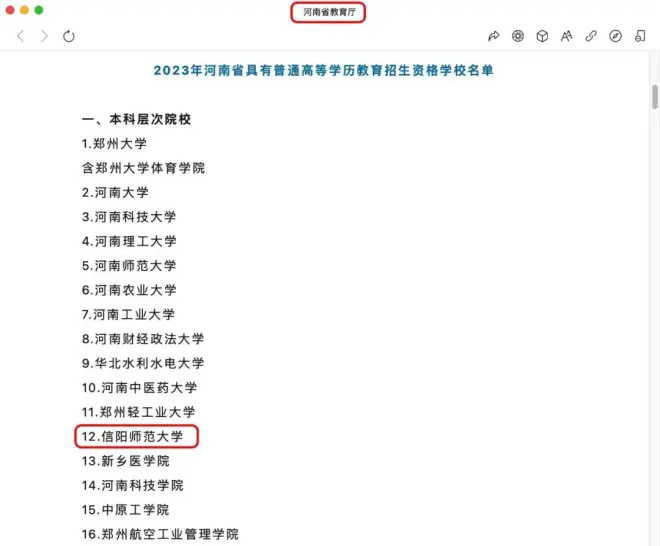 近日,据大河报网信息,6月6日,教育部发函,同意信阳师范学院更名为信阳师范大学。文件中提到,根据《中华人民共和国高等教育法》《普通高等学校设置暂行条例》《普通本科学校设置暂行规定》有关规定以及第八届全国高等学校设置评议委员会评议结果,经教育部党组会议研究决定,同意信阳师范学院更名为信阳师范大学,学校标识码为4141010477;同时撤销信阳师范学院的建制。根据河南省教育厅最新公布的《2023年河南省具有普通高等学历教育招生资格学校名单》,其中明确提及河南省本科层次院校包括“信阳师范大学”。