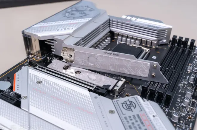 M.2插槽采用双层散热设计,上面的金属盖板支持快拆,按一下金属弹片就能轻松取下。接着取下主板底部的金属件,可以看到有四个M2插槽,最大均支持2280规格的M2固态硬盘。金属散热件的背面都标配有导热垫,可以将M2固态的热量快速传递给金属片,提高散热效率。这块板子的重量很客观,主板正面覆盖了大量的金属件。