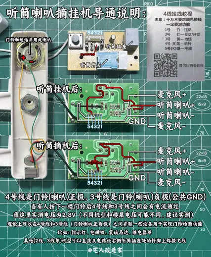 图片展示了听筒挂机和摘机后喇叭正负极线路导通的情况,仅供参考。