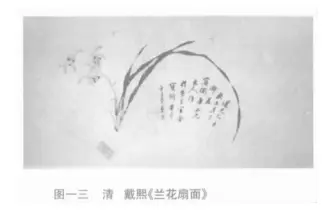 兰花是历代画家们经常画的花卉之一,然而在戴熙的传世作品中兰花是极少见,而兰花扇面更为鲜知,所以这幅扇面兰花显得极为珍贵。这幅墨兰图绘长短5只兰叶,均向右倾斜,除最左边的那只叶较短,其余三只,一只比一只长,中间那只最长,从根部向右上伸展,呈弓形向右下垂至扇面右下角。而且有三次断笔成飞白,第三只叶中间画一只兰花,三朵花盛开。构图简括新颖,布局妥帖匀称。笔法流畅,墨色浓淡相宜,三个长叶中均飞白。兰花和兰叶根部及左边两只短叶用淡墨,其余三只长叶用浓墨,花蕊也有浓墨点之,更使花朵明丽,表现出三只叶长短粗细,反转厚薄的质的层次感。款署:“道光己亥秋七月下瀚为衢年,兄大人作。于粤学官舍宝研堂中,年皇帝戴熙”,钤“醇土”印,有“裴景福收藏阁秘籍”藏印。道光己亥为1839年,作者时年38岁(图一三)。