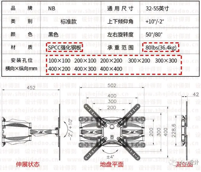 壁挂式支架的可旋转角度和承重范围因产品而异,不同的产品还可以有更大的旋转角度和承重性能。