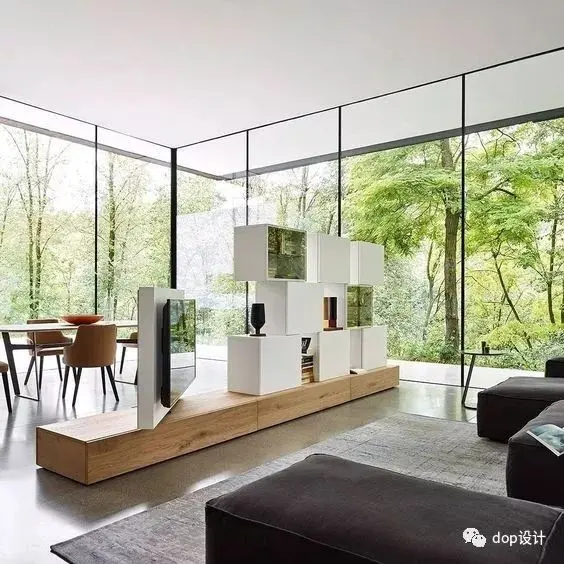 这种一体化由“轴”连接电视旋转的支架可以很方便的和室内家具,隔断组合在一起,并不局限于室内的空间,也是设计师普遍采用的形式,设计师只需要和厂家沟通好造型,材料,完成面尺度就可以了。