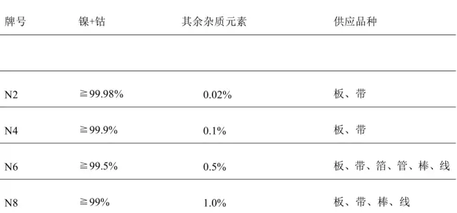纯镍是指 Ni 含量大于 99%以上的合金。近似银白色、纯镍有加工纯镍和电镀阳极镍。加工的纯镍主要有 N2、N4、N6、N8 等代表牌号,其供应的品种分别是二号镍为板材、带材;四号镍也是板材、带材;六号镍是板材、带材、箔材、管材、棒材、线材;七号镍与六号镍供应品种一样;而八号镍供应板材、带材、棒材、线材 。其化学成分及杂质含量可见表。在纯镍的各种加工材中常用的当属 N6 板材,其不仅有良好的冷、热加工性能,而且非常耐碱性环境腐蚀,因而在环保、化工领域有很多应用。