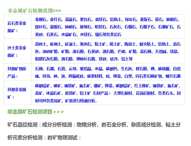 质量检测、成分分析、硬度检测、目数检测、白度检测、硅含量检测、钠含量检测、铁含量检测、三氧化二铁测、颗粒检测、酸溶解度检测、纯度检测、水分检测、含泥量、放射性、粒径大小、物相分析、密度检测等。
