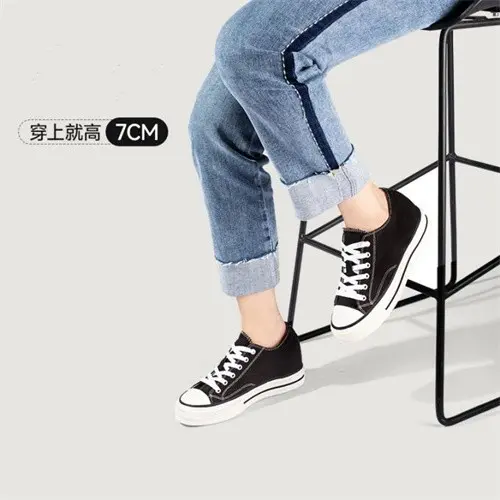 它的时尚设计、自带增高效果、舒适度和情侣款式,都让它成为了一双不可错过的鞋子。如果你想要一双既时尚又实用的鞋子,那么这款情侣经典黑色低帮帆布鞋绝对是你的不二之选!