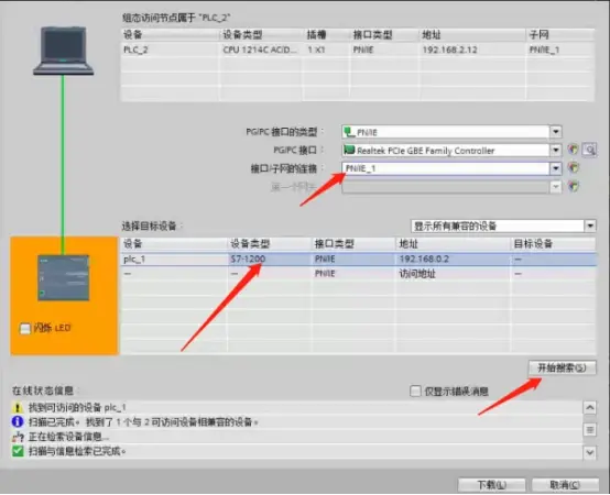 在工具栏中找到下载按钮并单击,在“接口/子网连接”的下拉菜单选择PN/IE_1插槽,点击搜索,选择自动搜索的设备,点击下载,按照提示向下操作完成组态下载。