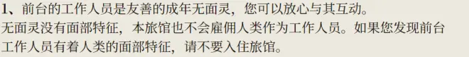 面灵没有面部特征,本旅馆也不会雇佣人类作为工作人员。如果您发现前台工作人员有无着人类的面部特征,请不要入住旅馆。