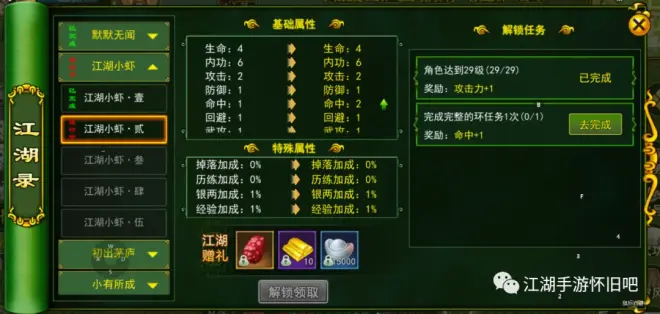 江湖录里的任务我们也要多关注,因为江湖录里的任务会有额外的经验加成。