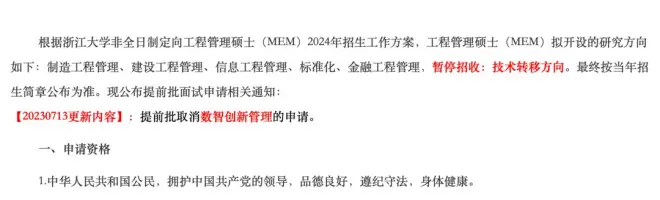2024年浙大mem项目提前批面试申请截止日期为7月25日,目前正在如火如荼进行中!但是出现了一些变数:数智创新管理方向提前批面试申请取消!