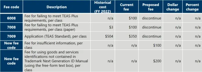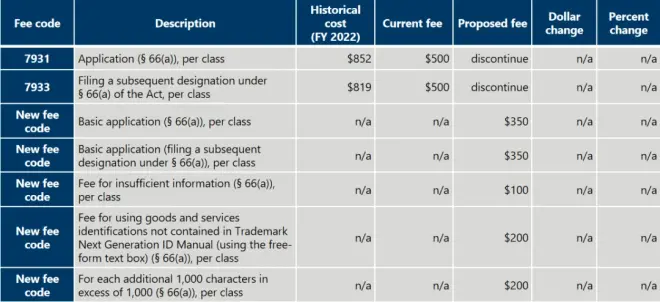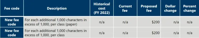 增加马德里申请每个类别的基本申请350美元;每个类别下提交后续指定的基本申请350美元;每个类别的信息不足费用100美元;每个类别使用不包含在商标下一代ID手册中的货物和服务标识(使用自由格式文本框)的费用200美元;每个类别超过1,000个字符的额外每1,000个字符费用200美元。