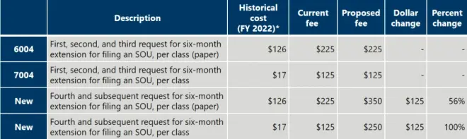 增加每个类别的第四次及以后申请延期六个月提交使用声明的请求(纸质申请)由225美元上调到350美元,上调幅度56%;