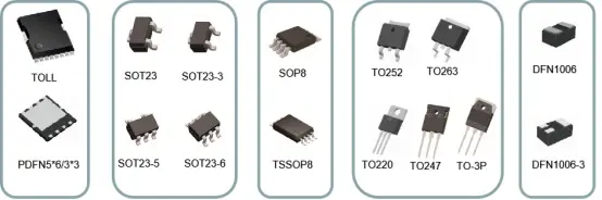 (5) 从封装是有PDFN3.3/5.6, TOLL,SOT23/-3/-5/-6,SOP8/TSSOP8,TO-252/251/220/263/247/3P, DFN1006,DFN1006-3,CSP1.1X1.1/2.14X1.4等