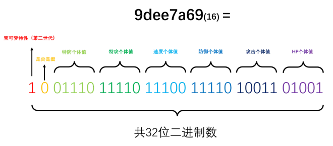 按照官方的说法,个体值“占用5位字段”,这句话的意思是说,单个个体值占用5个二进制位,原因非常自然,要表示0~31共32个取值,5位二进制数刚好够用()。再结合下面这句:“所有的个体值一起存储在一段32位(4字节)字段中”,32位二进制数就是8位十六进制数,于是我们知道了个体值的变量取值的长度,和上一期专栏中的金币数是一样的。最后,这句话“接下来的三十位依次决定宝可梦的特防、特攻、速度、防御、攻击、HP的个体值”,更加自然,因为5*6=30,六项个体值,每项占5个二进制位,一共占30位。