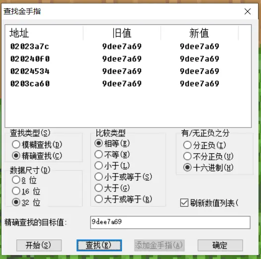 有两点需要注意。“数据尺寸”这里要选32位,因为要查找的变量取值是32位二进制数。另一个是“有/无正负之分”这里,之前的用法都是用的“不分正负”,这里用十六进制会方便一些,当然也可以先用计算器把9dee7a69转换为十进制,再选择“不分正负”。