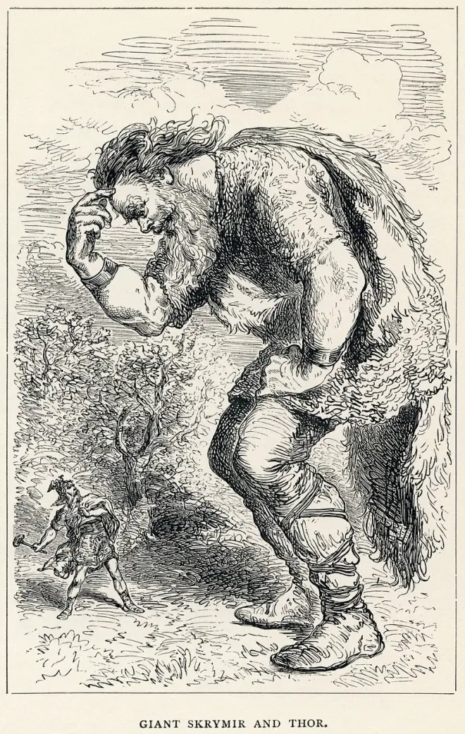 夜间,他们在一座“洞穴”里面休息,不料后来却发现那根本不是洞穴,而是一个自称斯克里米尔(“看似巨大者”之义)的巨人脱下的手套。斯克里米尔其后跟着他们一行人,在途中偷走他们的食物,让索尔一行人饥饿极了。在饥饿之下,索尔尝试趁着斯克里米尔睡觉的时候将他杀死,却未能攻破他的魔法护盾。他们后来才知道,斯克里米尔原来是乌特迦·洛奇变化而成的。