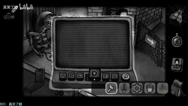7.院子往左边走,门上的密码机放上字母按钮D,解谜的方法是再不碰到其他线的情况下点击黑色字母按钮归位字母。顺序:BACDGEF。