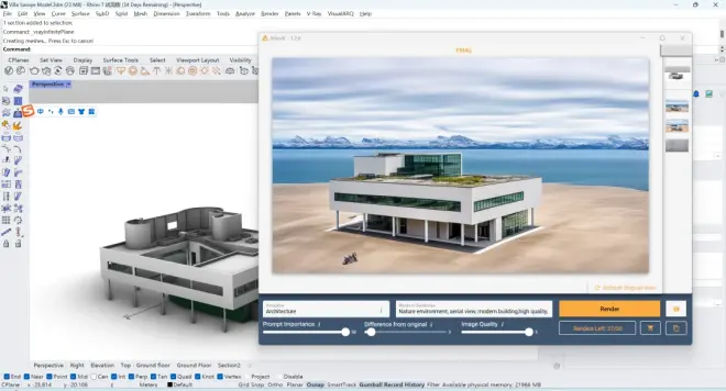 最下面有三个参数,Prompt Importance是关键词的权重值,即关键词对结果的影响的大小,数值越大关键词影响越大,数值越小关键词影响越小;Difference from original是渲染结果与原有模型的差异程度,大家也可以理解成AI创作的自由度,数值越小,变化越小,数值越大变化越大。Image quality则用于控制图纸的质量。数值越大质量越高,渲染越慢,数值越小质量越低渲染越快。大家可以依据自身的需要灵活设置。