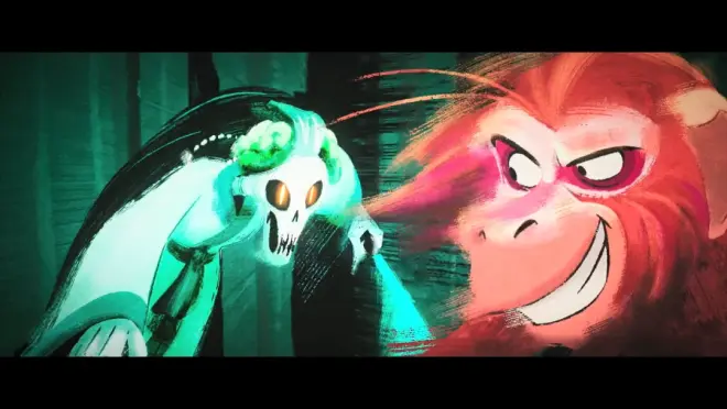 本作在视觉表现上最大的亮点,是猴哥的打斗场面,尤其是他逐一打败九十九只妖怪的二维动画段落,那种鲜艳而丰富的色彩,加之上窜下跳、飞来飞去、连续疾驰的动作设计,这些令我目不暇给。