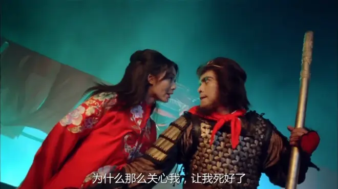 最典型的一场戏,是猴哥正与王母娘娘对打,为了不让事态变得更加糟糕,琳儿选择纵身一跃,希望促使猴哥赶紧离开天庭,来救自己。