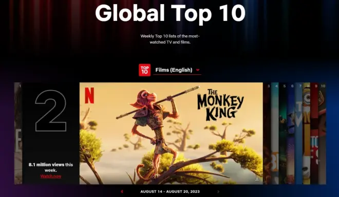 就在上周,《美猴王》在网飞全球播放量榜单中排第二位,观看数800多万。