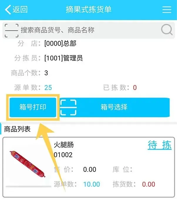 返回商品分拣界面,点击“箱号打印”打印箱号即可。
