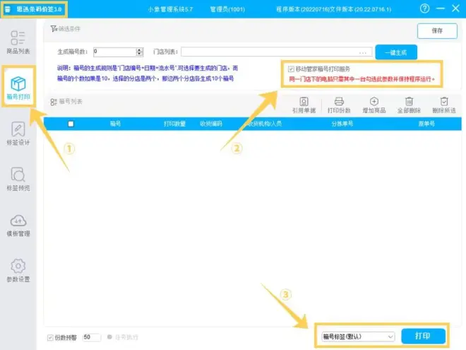 注意:需提前安装好思迅标签工具3.0并保持开启状态,并在设置 — 标签设置 — 箱号打印中,开启移动管家打印箱号设置。
