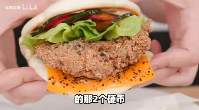 2.盖一片芝士片、胡辣椒磨粉、白腐乳制酱(掺了蛋黄酱?)、米粉炸鸡、熟芝麻、生菜叶、酱黄瓜