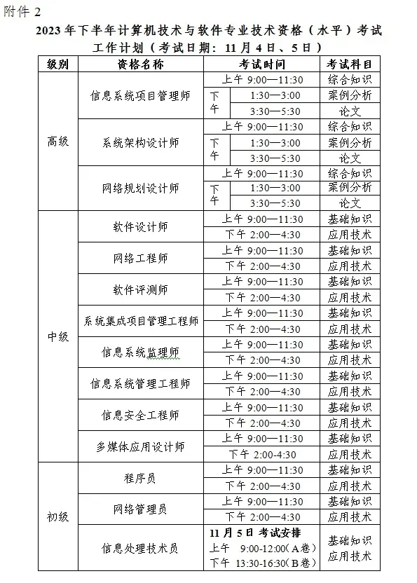 2023年下半年计算机技术与软件专业技术资格(水平)考试工作计划(考试日期:11月4日、5日)