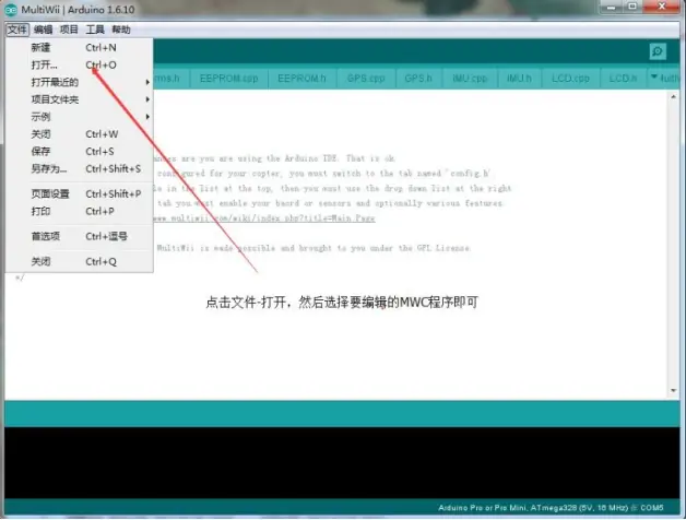 MWC固件是用Arduino IDE来编写,支持Arduino发布的几种主要的AVR开发板Pro Mini/Pro Micro/Mega等,也可支持使用STM32的Arduino兼容平台,但STM32目前无法体现出任何性能与端口上的优势,所以仍以AVR为主流,成熟、够用且稳定。
