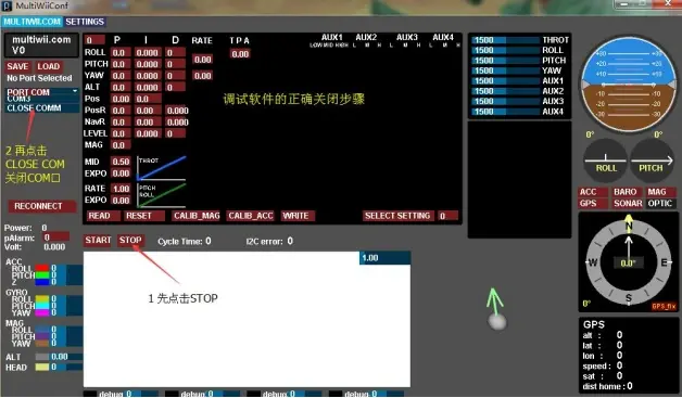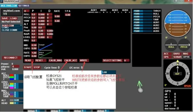 固件刷完,等待重启,然后打开附件中MultiWii_2_3(***) \ MultiWiiConf文件夹,里面有各系统的调试软件,按自己电脑系统打开就行。