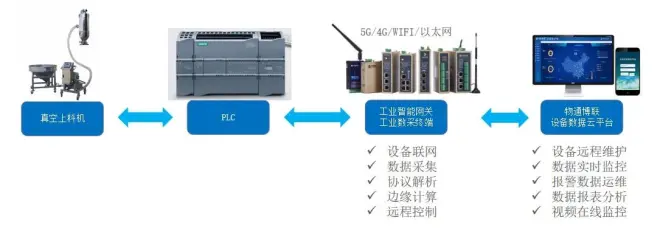 真空上料机主要解决粉料的收集输送工作,PLC主要控制的是风机和真空泵设备。工厂现场的PLC通过串口网口连接到物通博联工业智能网关,由网关采集数据并实时传输到云平台,实现远程监控、故障报警、远程控制和远程维护等功能,对上料过程和设备运行状态进行管理和优化,有助于增强管理的数字化水平。