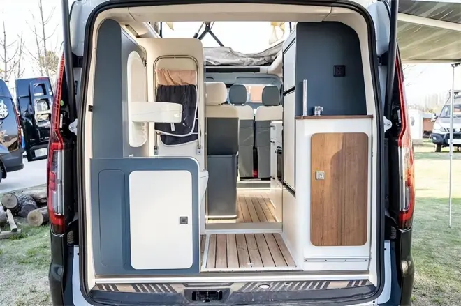 升顶完成之后,可以发现车厢内仍是瑞弗最爱的吸塑开模件,熟悉瑞弗的车友都知道,瑞弗的吸塑开模件都是航空级别的,无异味一体成型,用多久都不变形。内饰做工也显得非常精致,颜色搭配也符合现代年轻人的审美趋势。整车还是瑞弗一贯采用的轻量化、E0级环保型家具材质。
