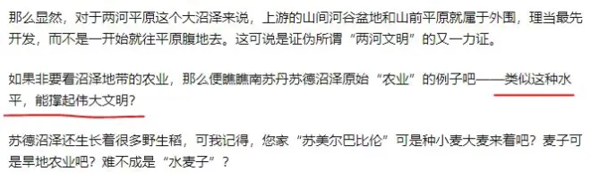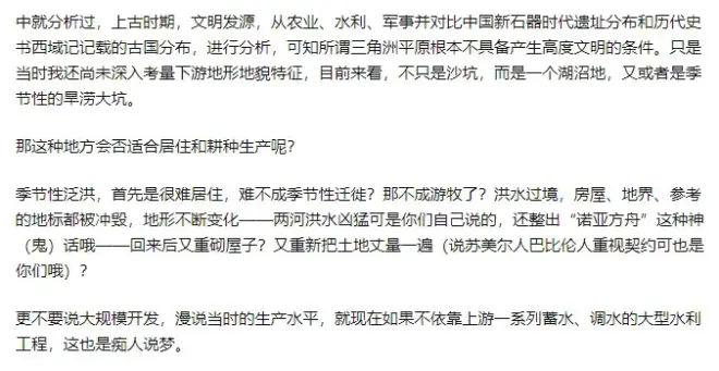 周楚山自己都说了,要么河够大经常泛滥,才能湿。看到我在上一页所引用的“地夷漫”了吗? 夷者,土地平坦也,纵有微波,亦不高也;漫者,水流四方也。你看,这不正是当年的两河流域气候湿热,河流纵横,土地平整开阔的景象吗?不然的话,也门西部,伊朗高原,有哪个地方符合这些特征?土地宽平一个给我看看? 在伊朗高原西南方,有一个靠近波斯湾的小块平原。但此平原太小,河流不大,难以形成多河奔流的景象,因此只用作备选项。 除此之外,在描述地理环境之后,紧跟着就是描述种田、畜牧的文字——这说明当时的两河流域是适宜生存、足以农耕畜牧的。而且这个地方还不是中国使者刚抵达波斯就能看见的,由此可见,这是波斯的重要政治、经济、文化中心。不然,中国史官为什么要去记载这个水流四方、平坦开阔的地方,而不去写伊朗高原上的群山与盆地,更不去写也门的山城?难道使者、史官们不会抓重点吗? 3.两河流域开发于何时?