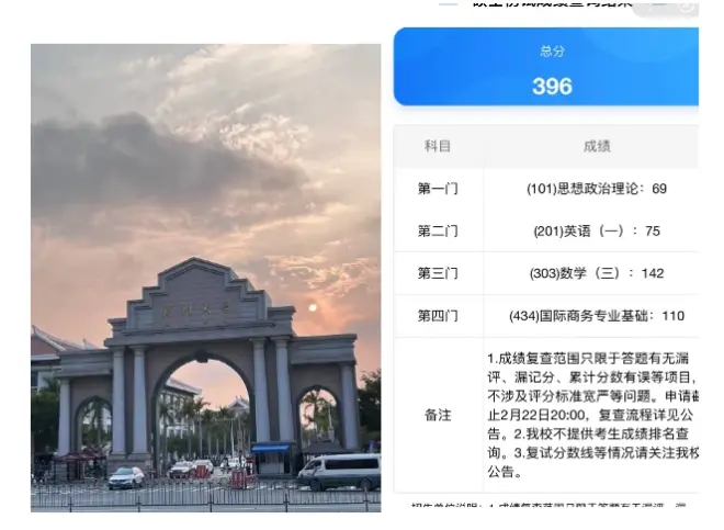 Hi,大家好,我是2023届厦门大学国际商务专硕的小天学长。在今年的考研初试中我的总分396分,数学142,英语75,政治69,专业课110。初始排名第三,复试排名第四。