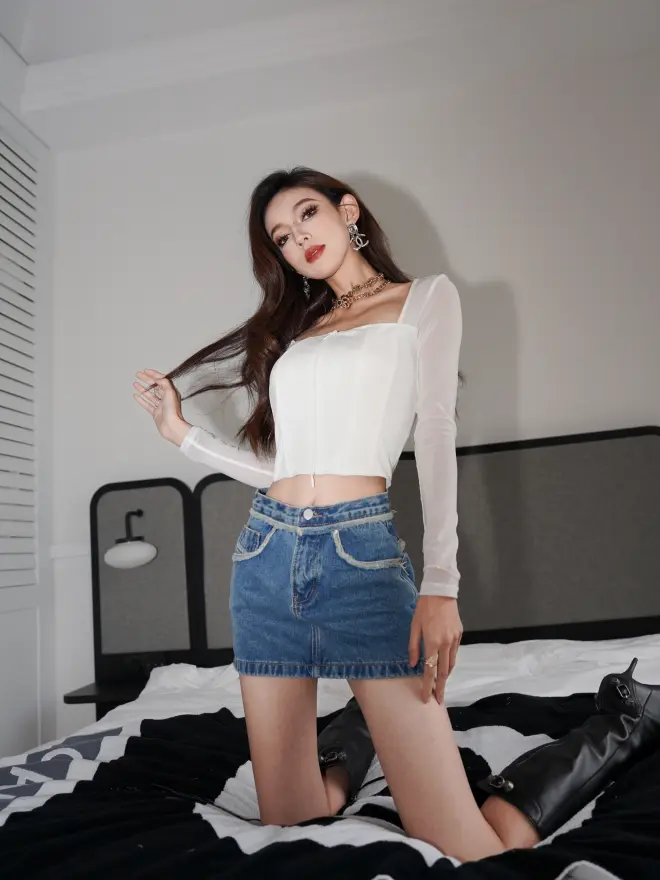 辣妹鱼骨 双拉链都可以打开的网纱不透白色上衣