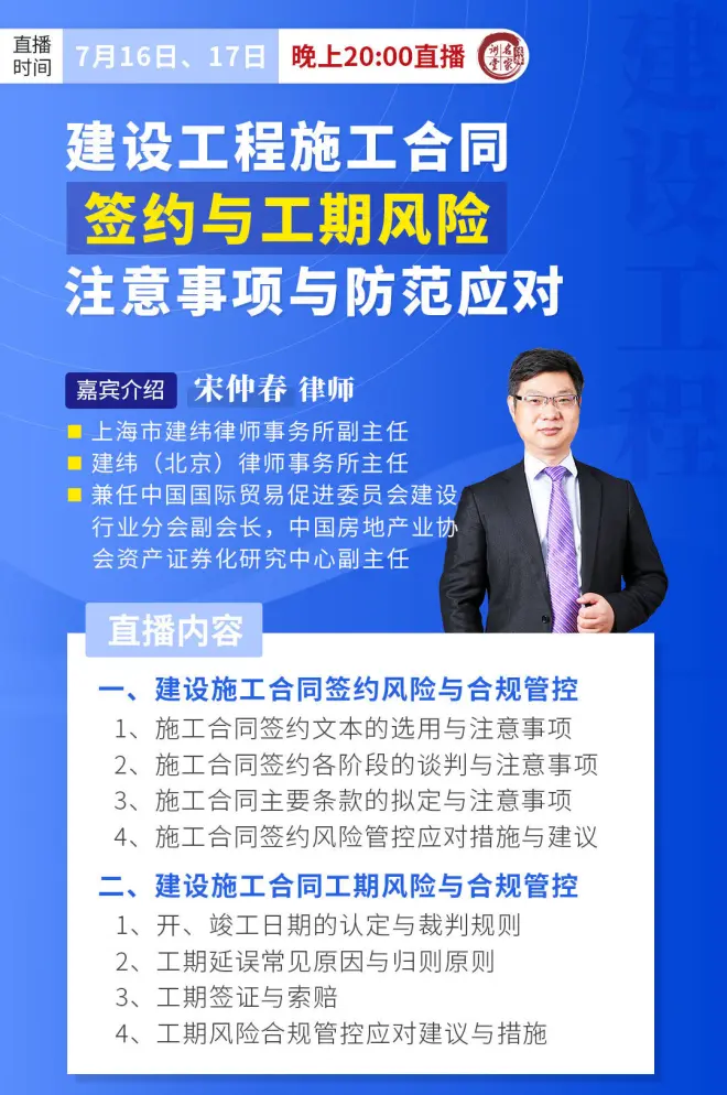 7月16、17日晚20:00 ,上海市建纬律师事务所副主任、建纬(北京)律师事务所主任宋仲春律师,在直播间,将结合多年的实务经验,为大家分享建工施工合同签约风险、工期风险与合规管控,梳理裁判规则与注意事项,以及实务应对措施。