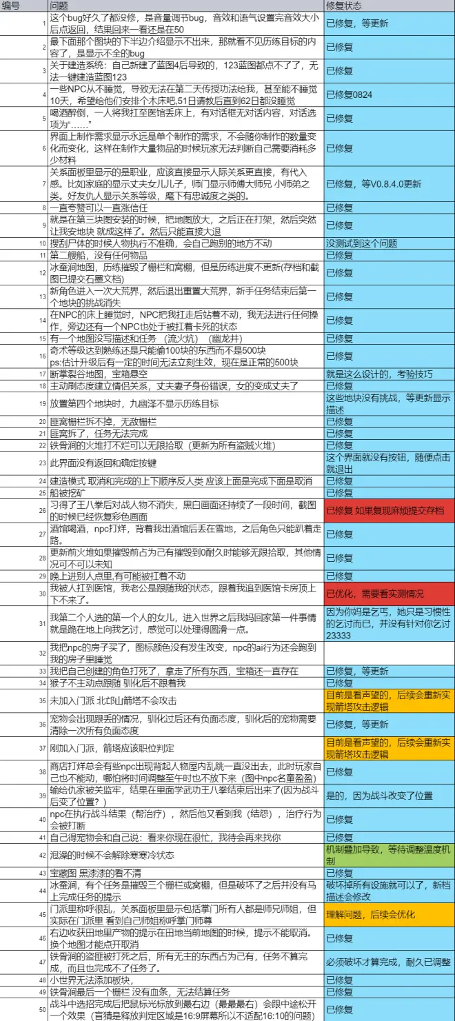 请查收《绝世好武功》抢先体验版本发售前最后一次Buglist!我们汇总了从开测至今所有的问题和目前修复的情况。本次内测期间我们累计收到bug提报270+条,其中大部分已经随着测试版本的更迭而修复,但还有一些涉及NPC运行逻辑、寻路问题以及易用性问题需要继续优化。欢迎各位玩家监督!