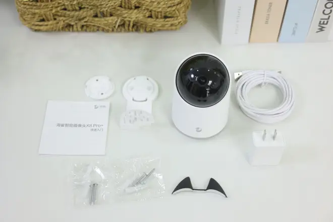 拆开包装,内部配件直观展现,除了海雀智能摄像头X8 Pro+主体外,还有充电线、充电头、安装支架底座,螺丝、说明书等配件。值得一体的是,当把这个小耳朵粘贴在摄像头上后,别提有多可爱萌趣了。