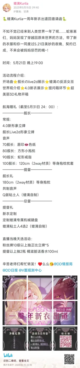 5月15日,蝰漓Kurlia宣布将于5月21日19:00举行一周年新衣出道回。