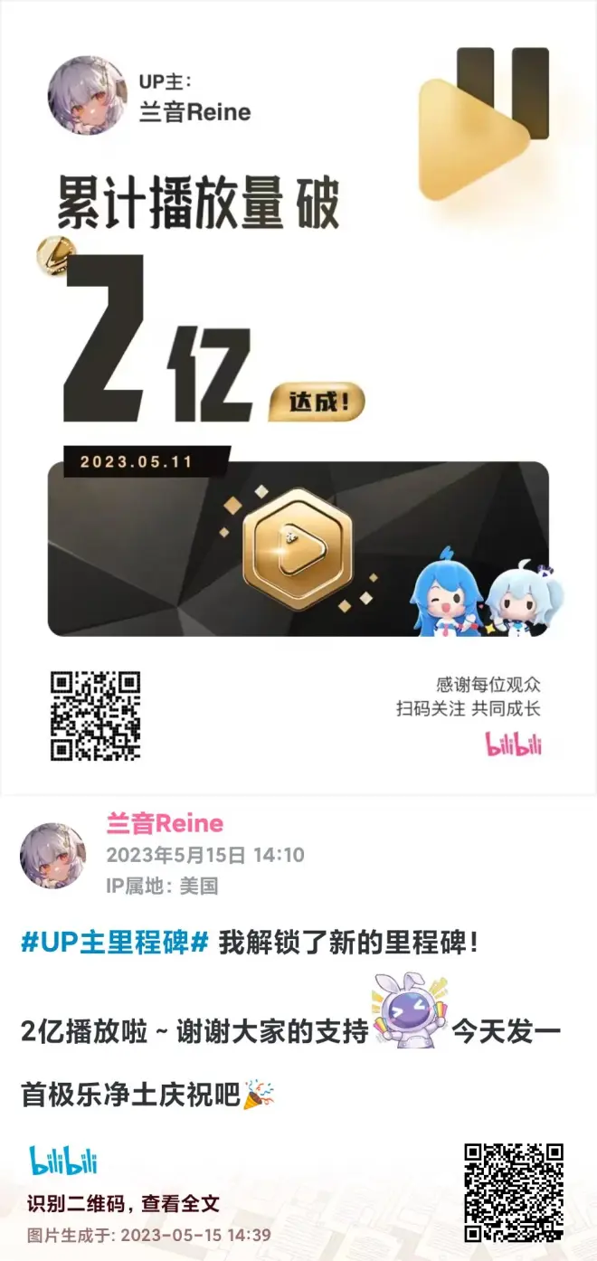 5月15日,兰音reine宣布稿件累计播放量于5月11日突破2亿。