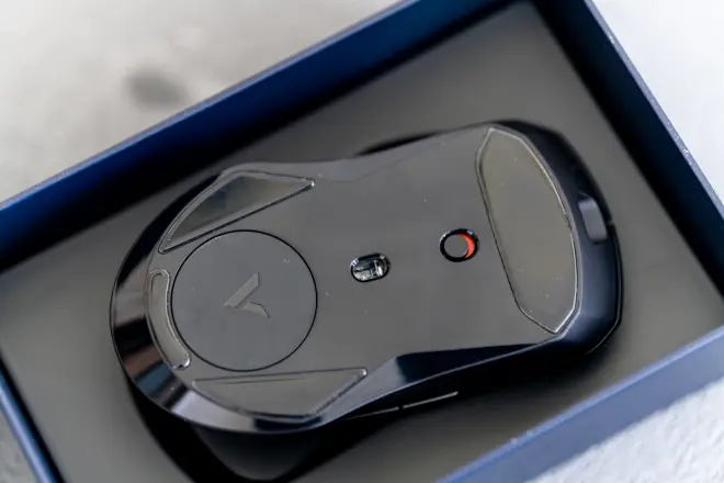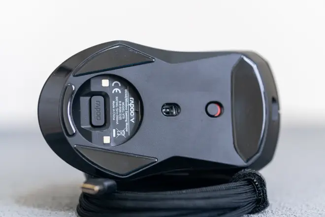 VT9底部应该说非常简洁,4块大面积胶贴配合织物鼠标垫非常顺滑稳健。鼠标的电源开关我感觉太小,完全可以再设计粗狂一点容易拨弄。红绿的底色标识倒是非常不错,很容易就可以辨别鼠标的开关状态。