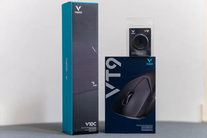 三件套分别是雷柏轻量化双模游戏鼠标VT9、V1P无线充电模块、V10C操作型游戏鼠标垫。